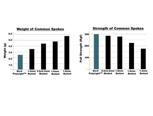 Berd spokes are made from an advanced polymer called ultra high molecular weight polyethylene (UHMWPE) that has 12 times the strength-to-weight ratio of steel and floats on water. Berd spokes have an improved fatigue life compared to steel and are impervious to the elements.